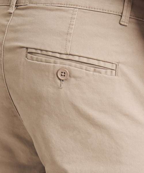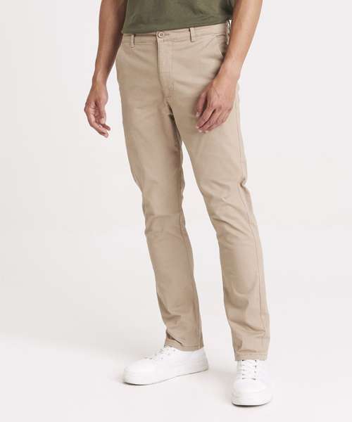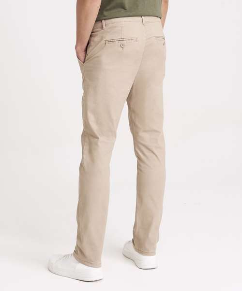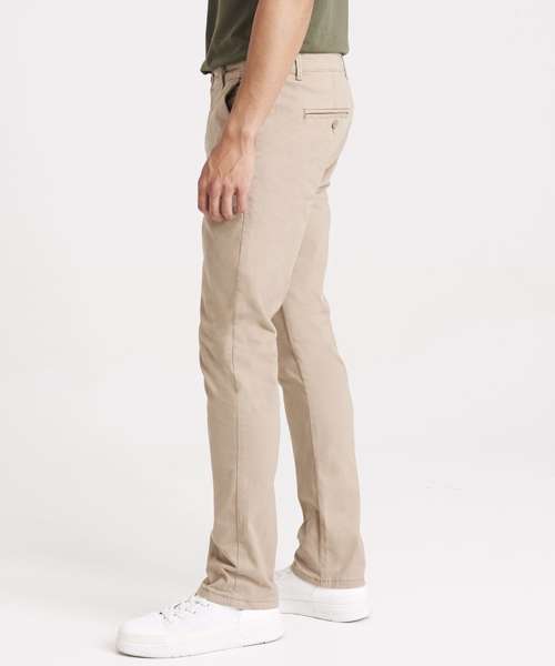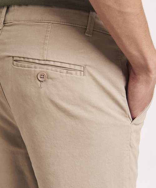 Slim fit chino made from stretch fabric for ease of movement. Featuring zip fly with button fastening at waist, belt loops, front slant pockets and button jet pockets at rear. Back jet pockets.