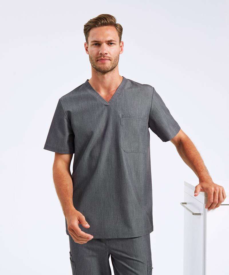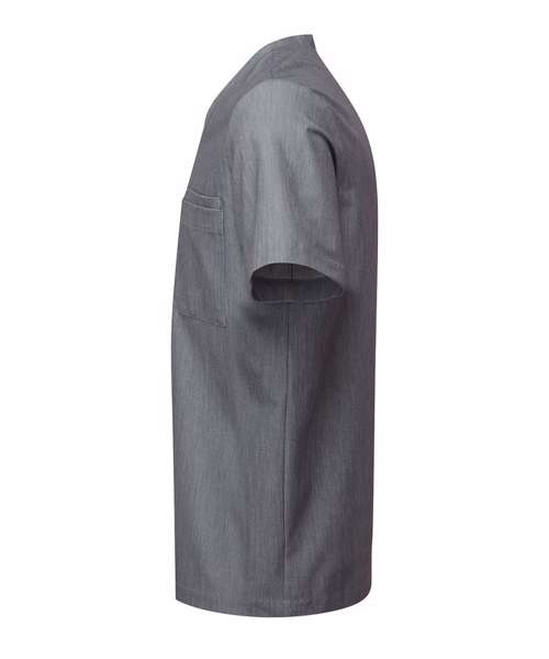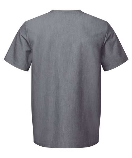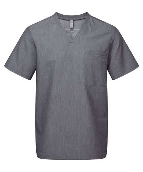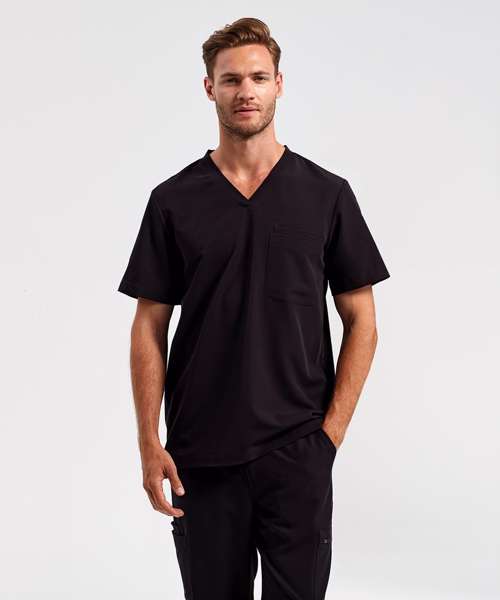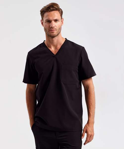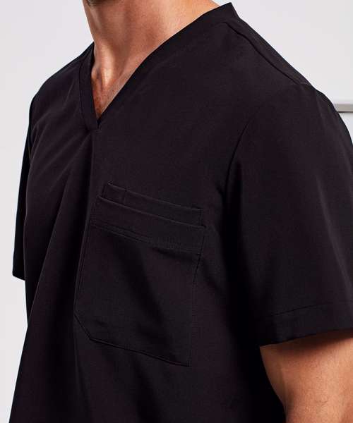 Men’s short sleeve scrub tunic. Comfortable four-way stretch. Breathable, easycare, crease-resistant fabric. V-neck, centre patch pocket with combined pen pocket. Back darts, side vents and modern fit. Decorate with embroidery and/or print. Contains certified recycled polyester.